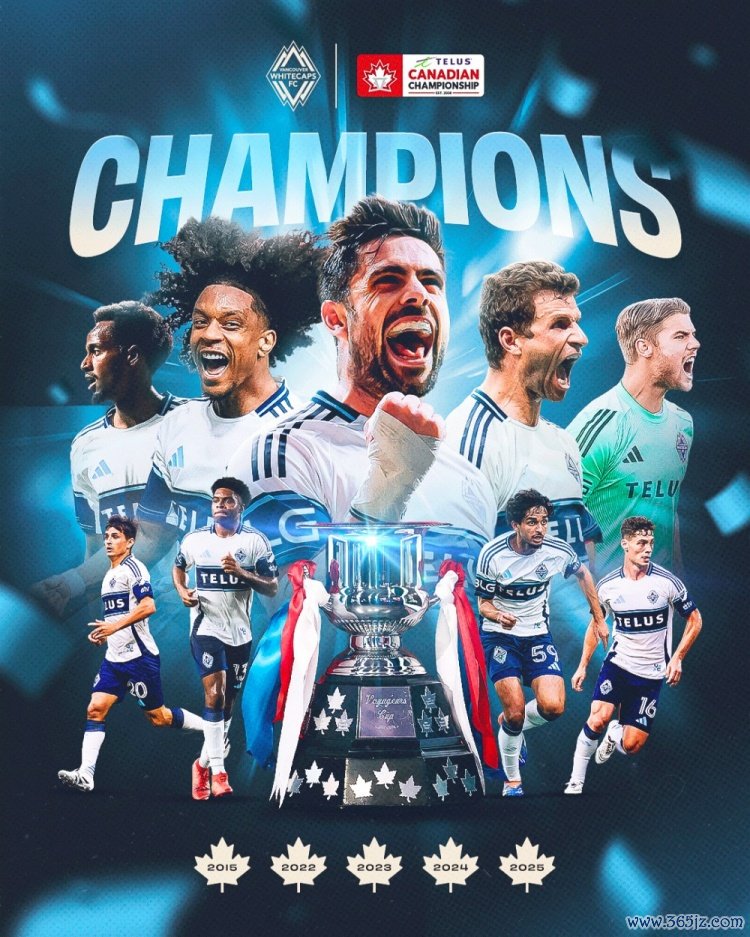 温哥华白浪第5次赢得加拿大冠军杯,仅少于8次夺冠的多伦多FC。