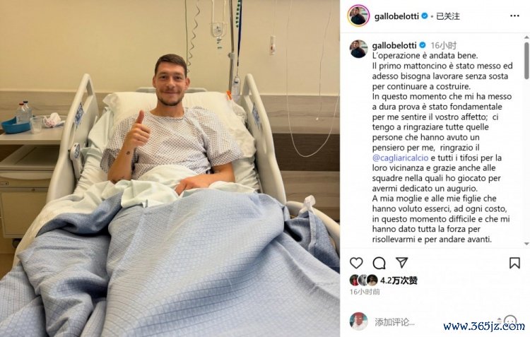 贝洛蒂在外交媒体上发布了术后含笑的像片并配文:“手术发扬顺利。第一块砖也曾铺好了,当今咱们要悉力连接建设。在这个劳苦本领,你们的眷注对我至关进军;我要感谢所有缅思我的东说念主,感谢卡利亚里足球俱乐部及合座球迷的复古,也感谢我效劳过的所有球队赐与我的祝愿。”