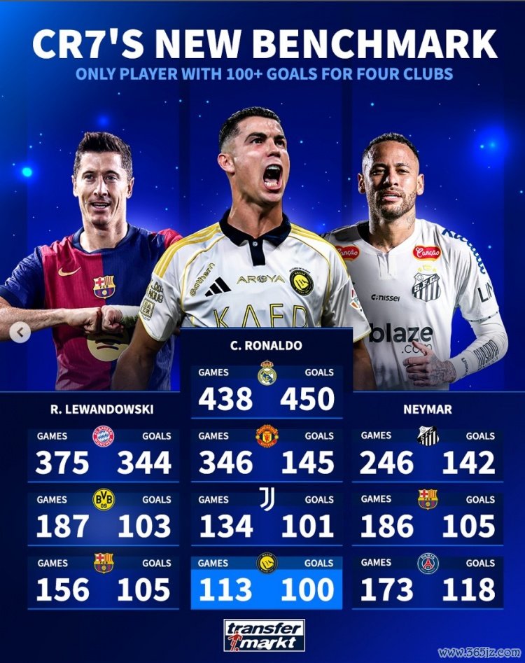 《转会商场》统计透露C罗亦然独一为4家俱乐部齐能已毕百球里程碑的球员:
