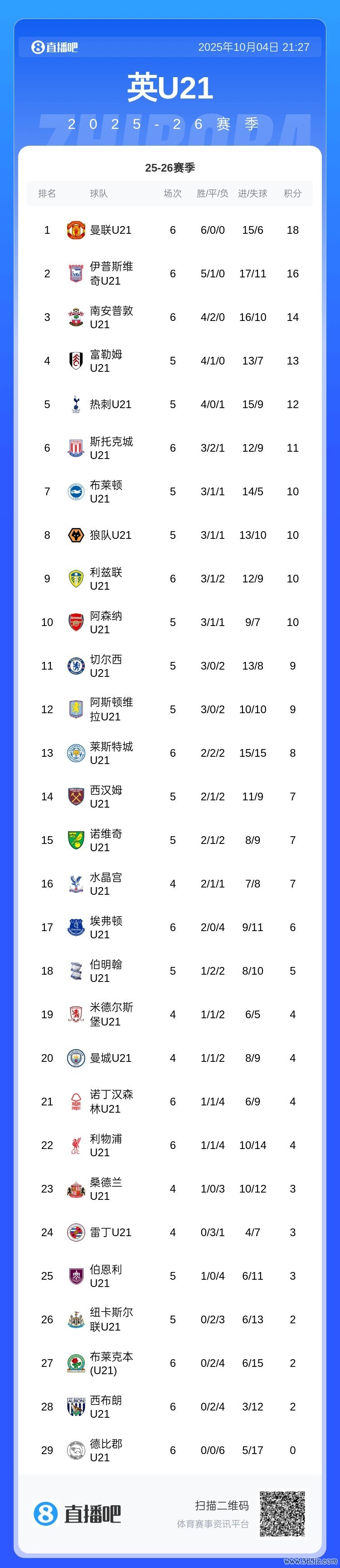 10月4日讯 英超U21联赛第6轮,曼联U21队2-1打败埃弗顿U21队。红魔后生军本赛季于今联赛6战保捏全胜,领跑积分榜。