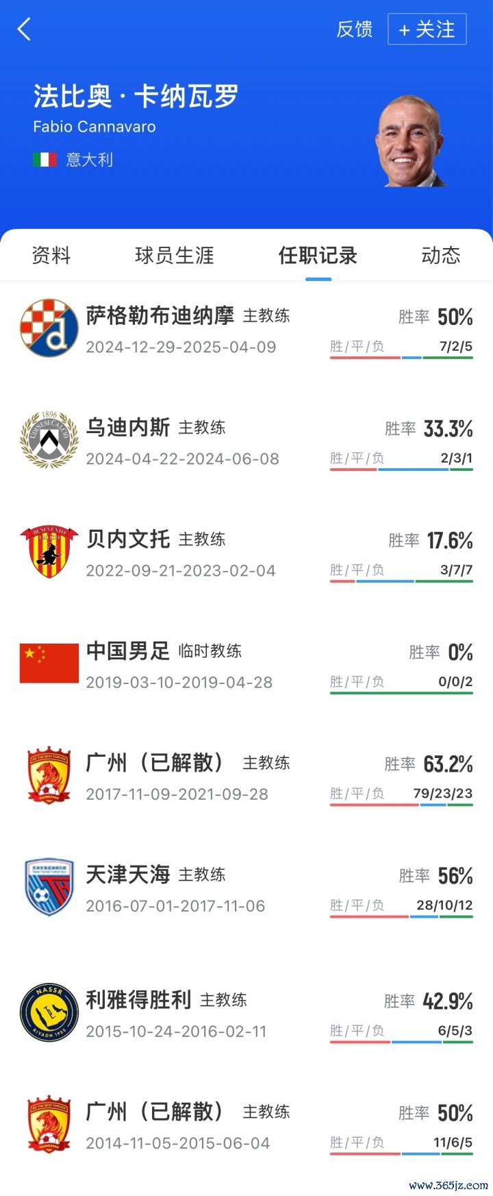 卡纳瓦罗现年52岁,曾捏教广州恒大、利雅得得手、天津权健、贝内文托、乌迪内斯和萨格勒布迪纳摩。2019年3月-4月,卡纳瓦罗曾出任国足临时主帅,带队成就中国杯,2场比赛均以0-1的比分不敌乌兹别克斯坦和泰国队。