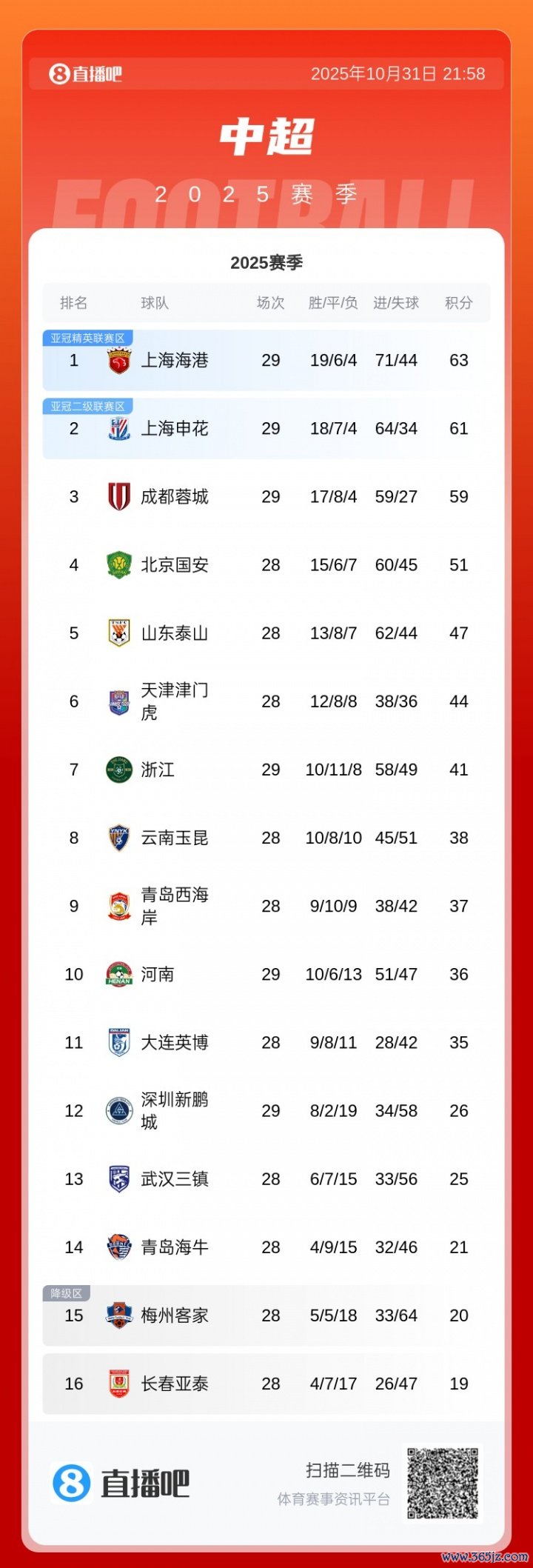 10月31日讯 中超第29轮截至3场要道较量,上海海港3-0浙江,上海申花1-0深圳新鹏城,成齐蓉城1-2河南。中超积分榜上,海港向上申花2分,末轮只有打平即可夺冠,成齐蓉城则提前一轮退出了冠军争夺。