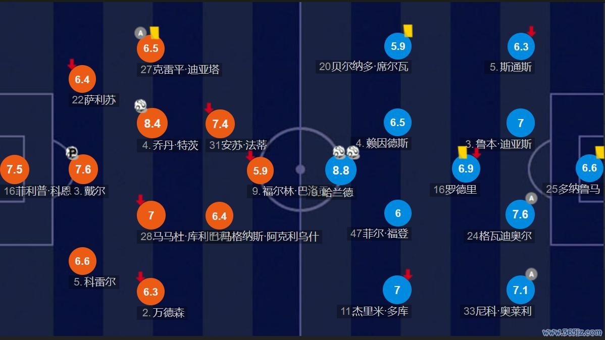 天然,贝尔纳多也没好到那处。两东谈主永诀被给到了本队第一、二低评分的。