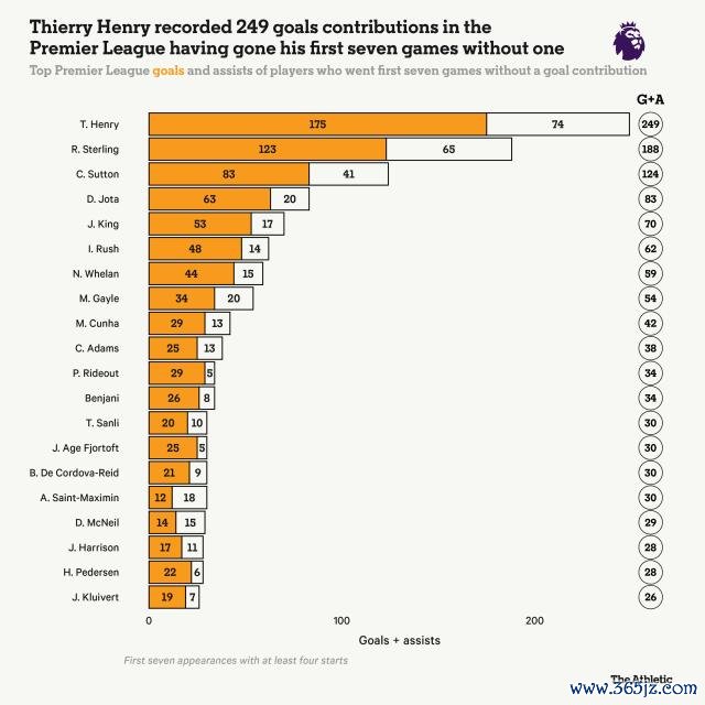 如今维尔茨明显也遭遇了适合周折的问题,如果他的走向和桑乔相通,那利物浦岂不是亏大了?虽然,并不是扫数开局不顺的新东谈主皆是桑乔。就此竞技网作念了个统计,发现英超史上共有75名先锋在某种意旨上合稳健“007”的程序,在其前7次英超出战时“寸功未建”(其中至少有4次是首发)。其中也有不少名将,最着名者当属前阿森纳外传弓手亨利,其在加盟枪手后的前7场英超中既无进球也无助攻——从意甲尤文图斯转到英超,这位过去只须21岁的法国先锋也一度很不适合。但临了,亨利缱绻参与了249次英超破门,包括175粒进球和74次助攻。