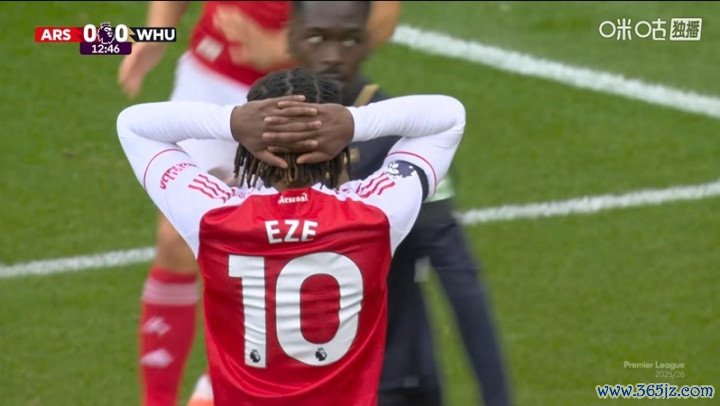 直播吧10月04日讯英超第7轮,阿森纳vs西汉姆联。比赛第13分钟,埃泽濒临佛门凌空踢飞,枪手错失良机。