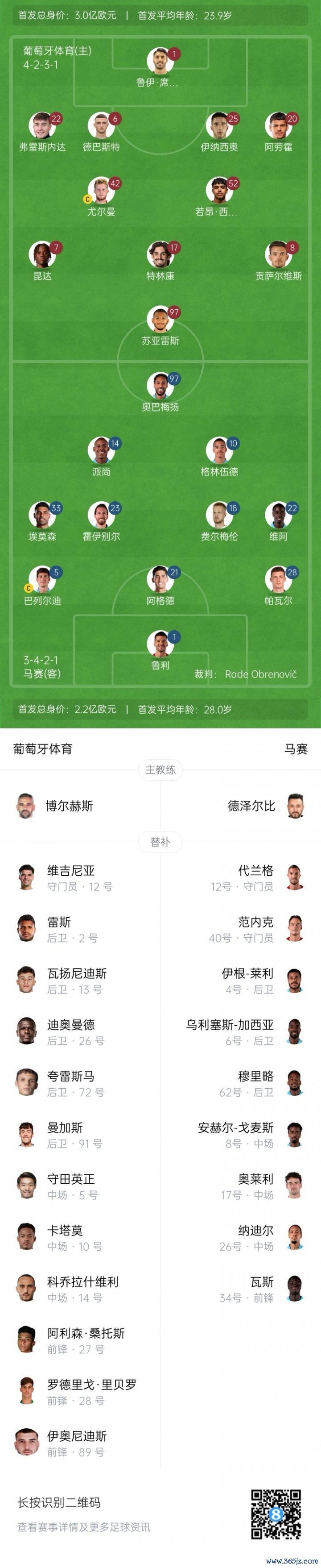 葡萄牙体育替补:12-维吉尼亚、2-雷斯、26-迪奥曼德、72-夸雷斯马、91-曼加斯、5-守田英正、10-卡塔莫、14-科乔拉什维利、27-阿利森·桑托斯、28-罗德里格·里贝罗、89-伊奥尼迪斯