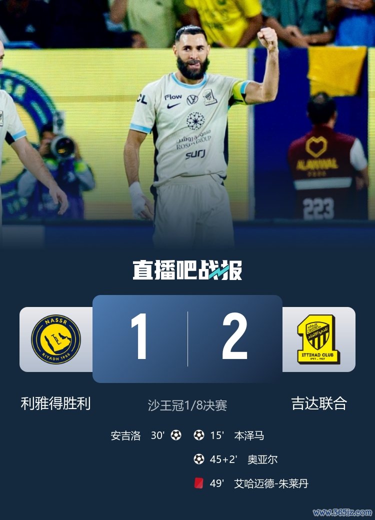 本泽马推射破门,奥亚尔抽射立功,最终利雅得成效1-2十东谈主吉达集会无缘八强。