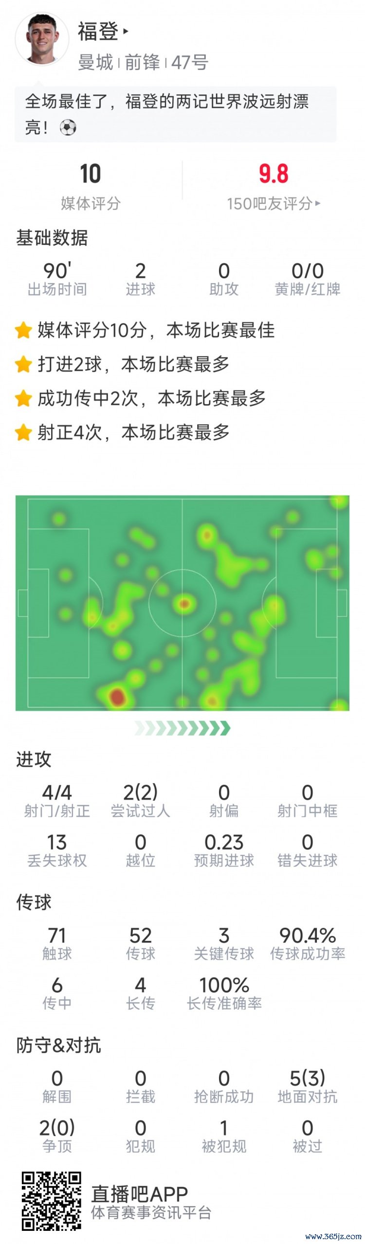 11月6日讯 在本轮欧冠,曼城4-1打败多特,以下为福登本场数据: