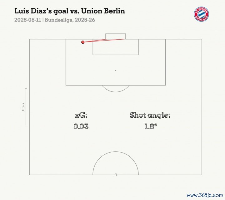 迪亚斯底线极限救球后,丝滑过东谈主,小角度劲射死角。这里进球的预期进球(xG)仅0.03,射门角度1.8°。