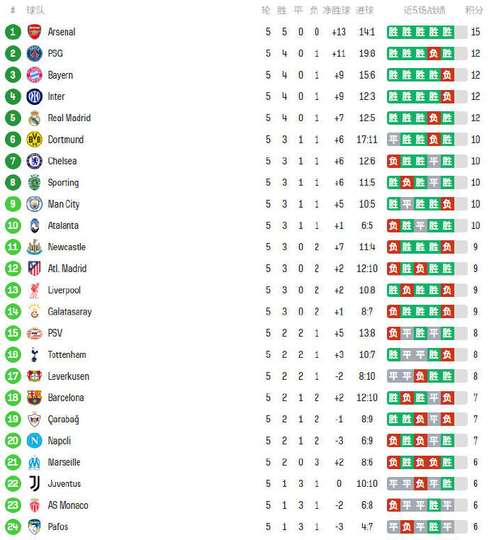 北京期间11月27日,2025-26赛季欧冠联赛阶段第5轮战罢。本轮事后,积分榜再次发生高大变化。阿森纳在一场“强强对话”中,镇守主场3-1力挫拜仁。成为5轮后独一保抓不败,而况全胜的球队强势领跑积分榜。