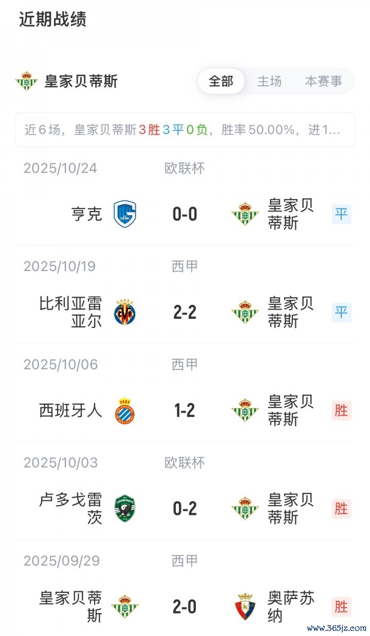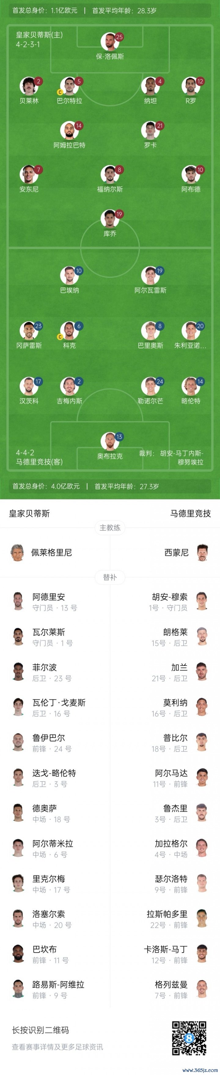 皇家贝蒂斯首发:25-保·洛佩斯、2-贝莱林、4-纳坦、5-巴尔特拉、12-R罗、8-福纳尔斯、14-阿姆拉巴特、21-罗卡、7-安东尼、10-阿布德、19-库乔
