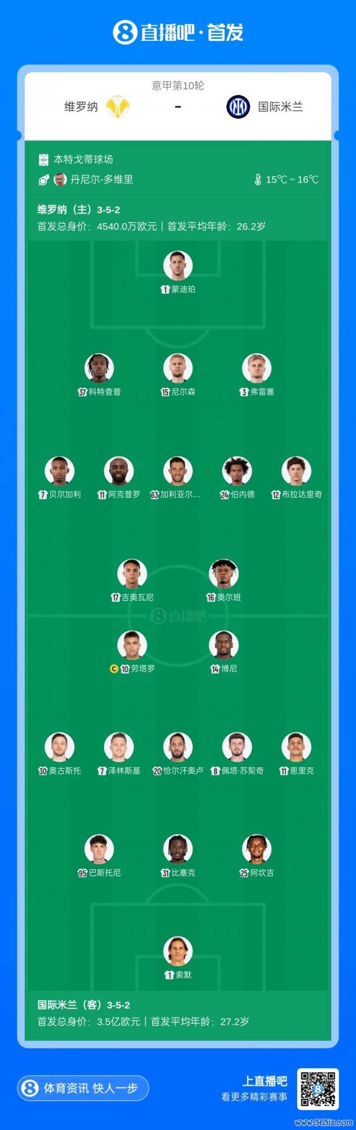 11月02日讯 北京手艺19点30分,意甲第10轮,维罗纳vs国米,赛前两边首发公布!【本场比赛国米方面,劳塔罗、博尼搭档锋线,恩里克赢得首发契机,巴雷拉、迪马尔科、邓弗里斯替补待命。】