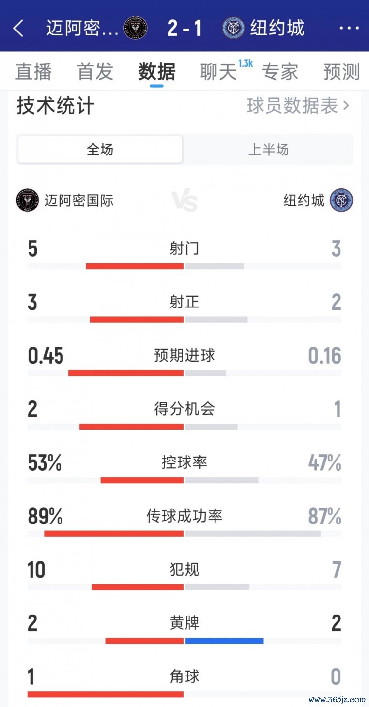 11月30日讯 好意思职联分区决赛迈阿密海外对阵纽约城半场战罢,迈阿密海外2-1暂时逾越,以下为两边半场数据对比: